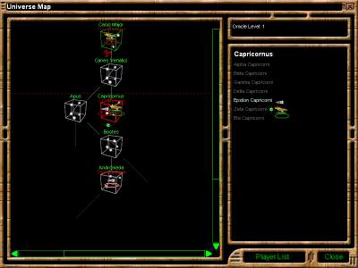 | This map of known sectors gets very handy when you must find your way around the Universe. Your Home Sector is always at the top of the tree. The map shows where your fleets and colonies are, which sectors your neighbors are in, etc. It even shows paths to unknown sectors. The red dotted line tells you how far your oracle level allows you to see without you actually having to go there. |